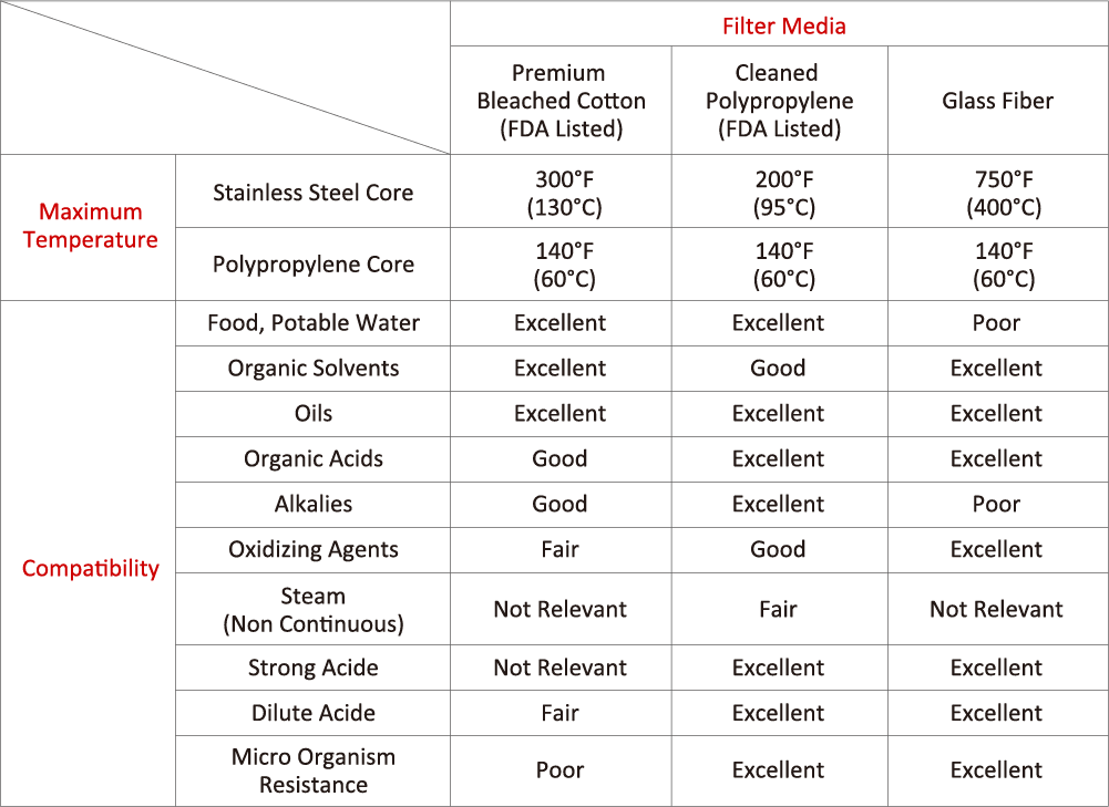 Cotton (FDA Listed), Cleaned Polypropylene (FDA Listed), Glass Fiber